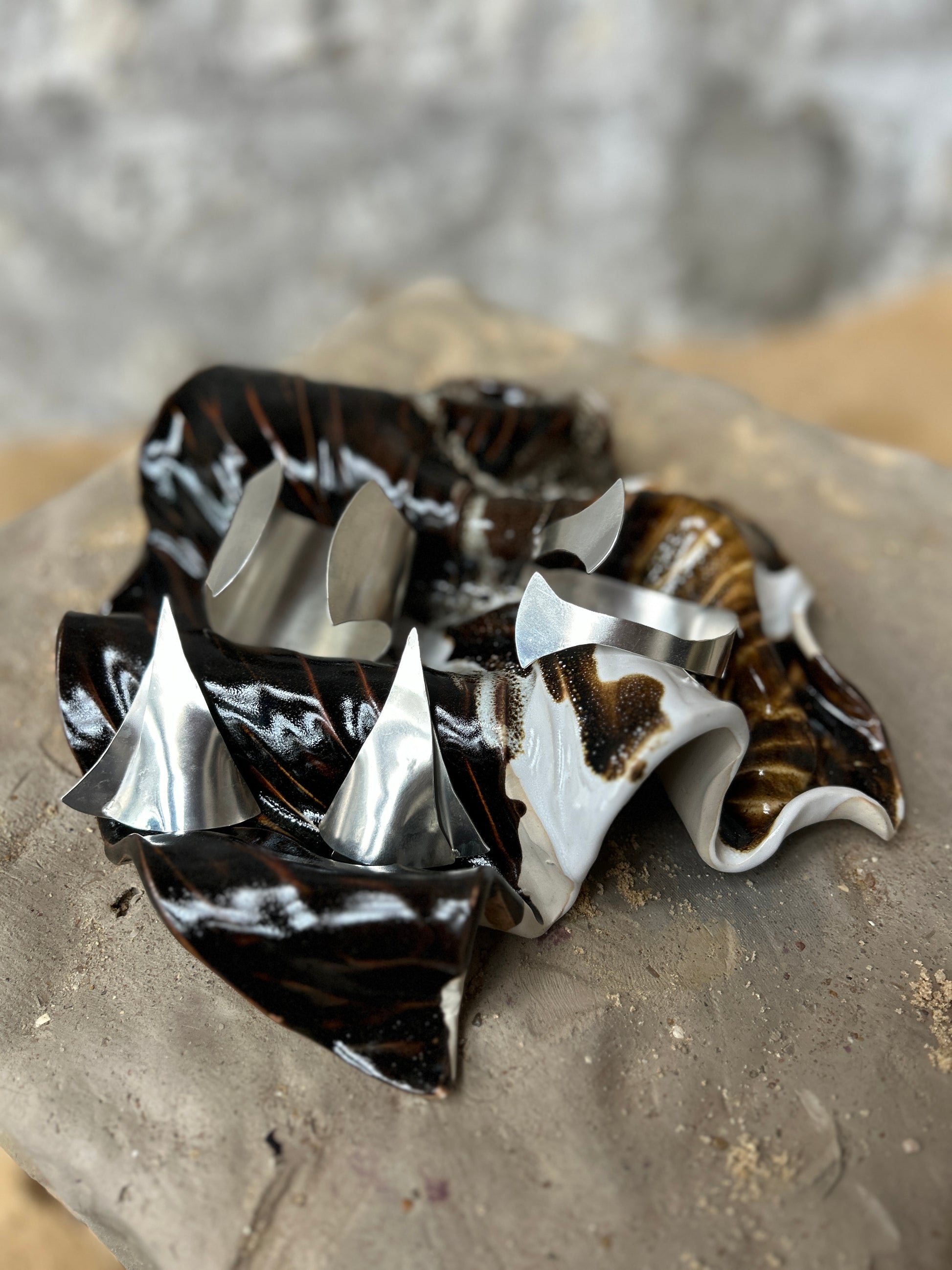 Collection limitée BRILHA. Pièces uniques en laiton plaqué argent, conçues par Georgie et Eva puis fabriquées à Paris par Eva.